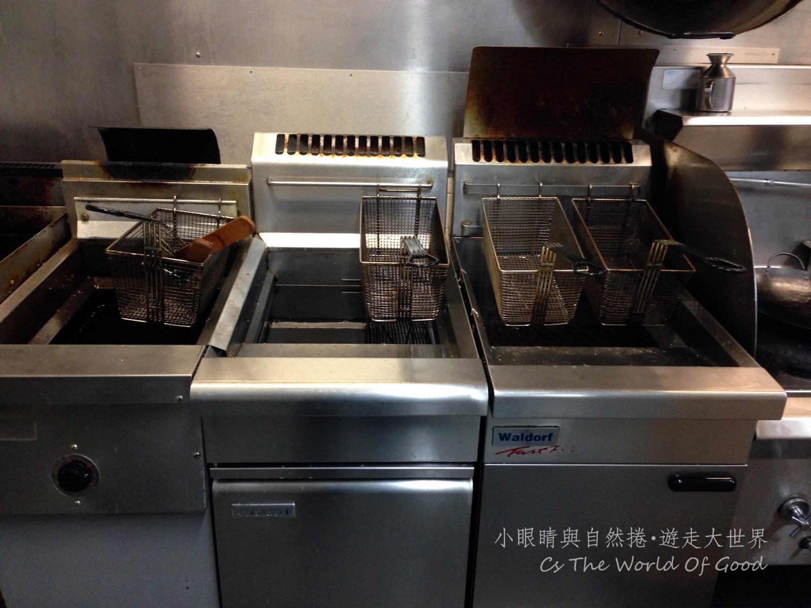 餐館只做午市和晚市, 營業時間是12時至2時和6時至9時半, 但因為要準備食材, 所以每天早上9時就要上班, 完了午市有約兩小時小休, 4時半又要回去工作直到晚市完結清潔廚房, 食完晚飯後10時左右就可以回家休息。油鑊主要負責的當然是炸物啦: 魚、羊架、薯條、炸子雞、點心(像燒賣)、春卷、雞卷、芝麻蝦、豆腐、古魯肉、排骨、炸鴨和炸香蕉, 由切魚塊、調較炸漿到出餐也是一手包辦的, 另外還需要焗雞翼、焗南瓜、薯蓉、煎T骨牛排和煎魚等......完全零經驗的我當然沒有可能一個人完成所有工作啦, 幸好我有好的導師和伙伴, 約一個月時間我而能夠自己應付大部分日常工作, 但要用刀的還是留給大師傅吧! 除了食物這些工作, 每天完了晚市還要洗廚房(主要是刷地), 對我這個在香港從事文職工作的人, 刷地真的很累很辛苦。另外還有一個很危險的工作, 就是換油(為保持食物質素, 約一星期就要換一次), 不是普通的油, 是200多度高溫的油啊, 現在回想起來也覺危險。